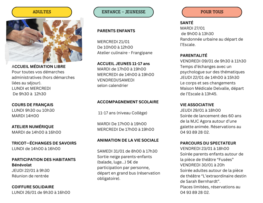 L’Escale de la MJC Agora 157, route de Turin – Nice 04 93 89 28 02 mjcagora.nice-est@wanadoo.fr